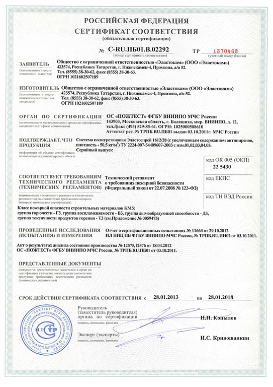Пенополиуретан (ППУ) является самозатухающим и трудновоспламеняемым материалом. Он не поддерживает горение (Г2) и имеет класс пожарной опасности КМ3 - практически не выделяет вредных веществ.